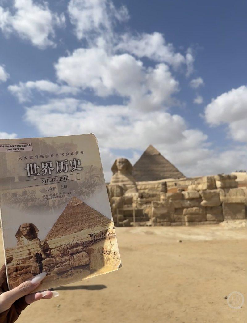 2月底,在埃及胡夫金字塔,游客“小甲鱼”按图索骥,来到狮身人面像附近一处隐蔽的铁皮隔板旁。她蹲下身,从隔板下的石洞里掏出一本初三《世界历史》教材。封面上印着的,正是眼前这座矗立四千多年的金字塔。“基本上一个洞里就有一本,都是中国游客专门留下来的。”“小甲鱼”介绍。
