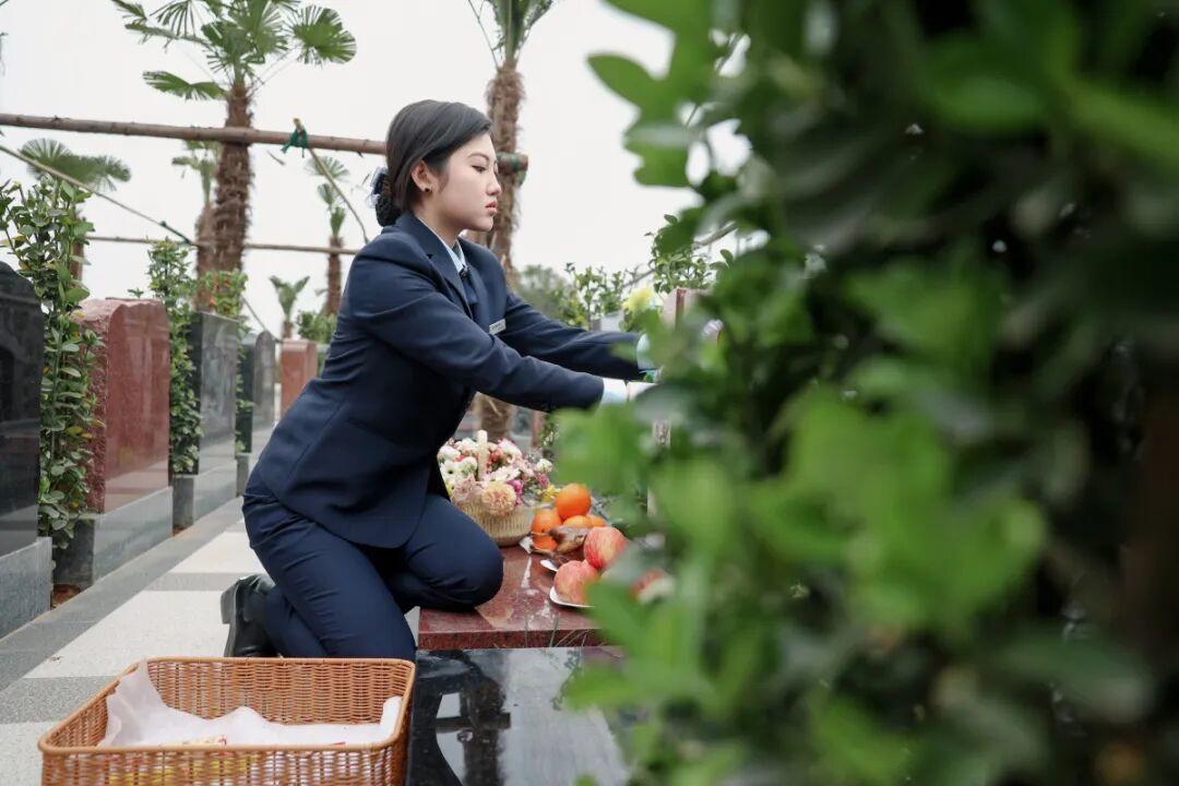 清明将至,位于河南省洛阳市孟津区的凤凰山生态纪念园内,松柏苍翠,气氛肃穆。一个年轻的身影穿梭在墓碑间,她手捧鲜花,神情庄重,对着墓碑深深鞠躬,然后轻轻擦拭碑面,摆放供品,同事拍下祭拜的过程发给逝者家属——让屏幕那头的亲人安心。