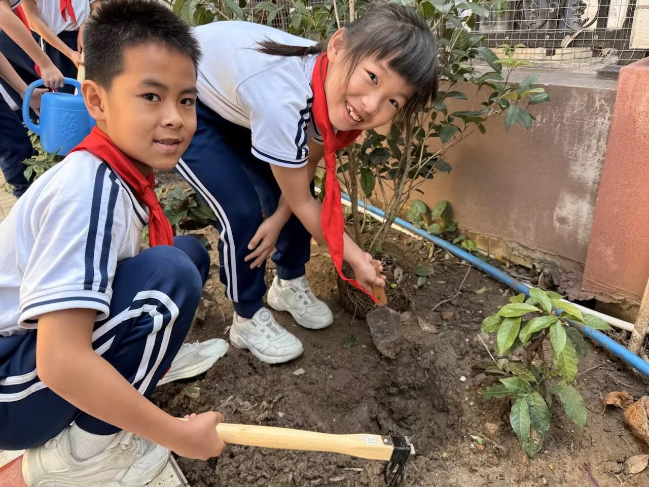本次活动中,学校以党建带团建、队建,把生态理念、劳动教育与实践体验融为一体。在老师、家长与街道党员代表的陪伴下,少先队员们亲手扶苗、培土、浇水,种下70棵金桂树苗,在劳动中深化对绿色环保的理解。