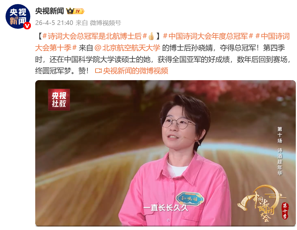 随后“中国科学院大学”微信公众号发布消息:在实验室里,孙晓婧的日常与精密数据、空间环境模型相伴;而在4月5日晚总台央视《中国诗词大会(第十季)》年度总决赛舞台上,她以满腹诗华摘得冠军,让航天人的浪漫被更多人看见。