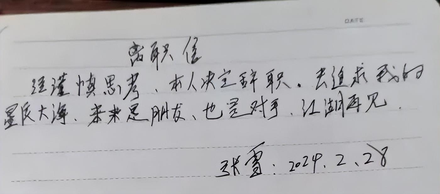 2024年2月28日,张雪手写了一封辞职信,放弃凯越的股份净身出户,去追求自己的星辰大海,“未来是朋友,也是对手,江湖再见。”
