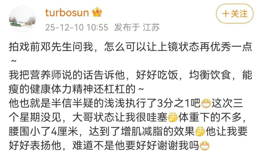 12月10日,孙俪在个人社交平台发文透露,邓超拍戏前问她,怎么可以让上镜状态再优秀一点。孙俪便把自己营养师说的话告诉他,“好好吃饭,均衡饮食,能瘦的健康,体力精神还杠杠的。”