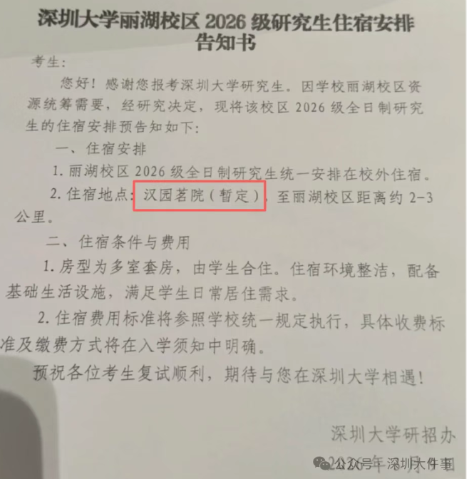 近日,网传的一则深圳大学《深圳大学丽湖校区2026级研究生住宿安排告知书》,引发关注。内容显示,丽湖校区2026级全日制研究生将统一安排在校外住宿,住宿地点暂定汉园茗院,至丽湖校区距离约2—3公里。事实上,高校通过收购或租赁校外住房来解决学生住宿问题并非个例,此前江苏省内也有高校采取过类似做法。