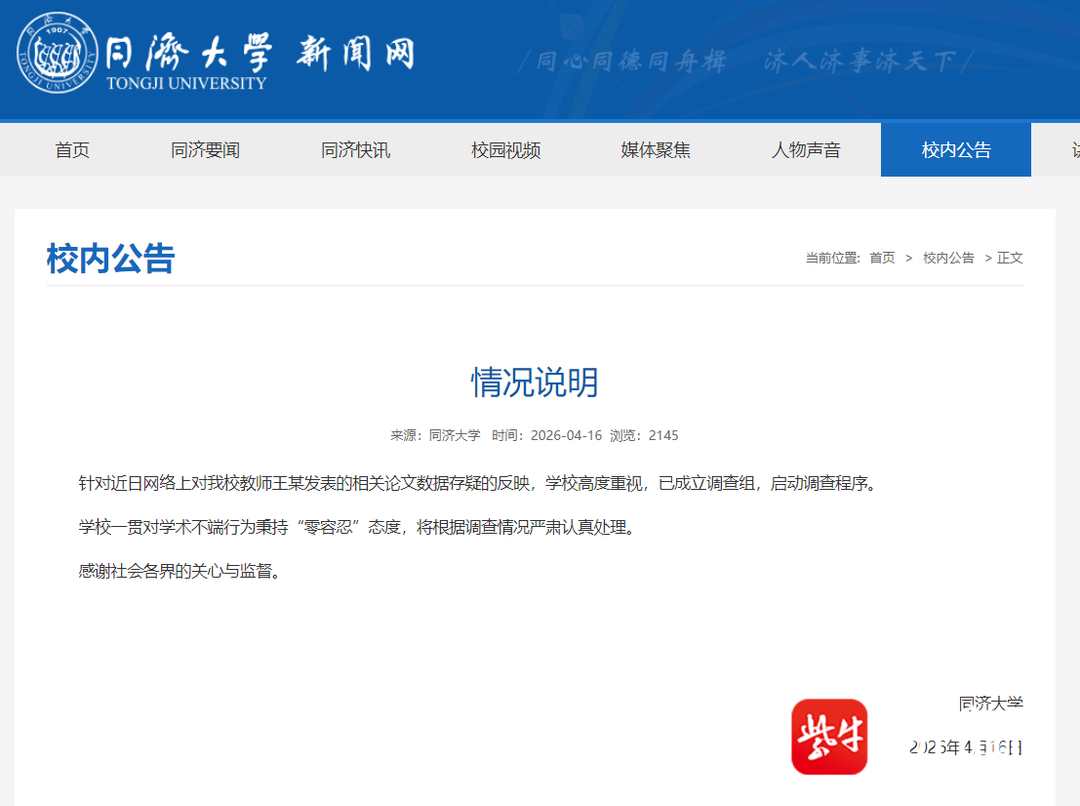 4月16日,同济大学新闻网发布情况说明,表示:针对近日网络上对教师王某发表的相关论文数据存疑的反映,学校高度重视,已成立调查组,启动调查程序。还表示学校一贯对学术不端行为秉持“零容忍”态度,将根据调查情况严肃认真处理。