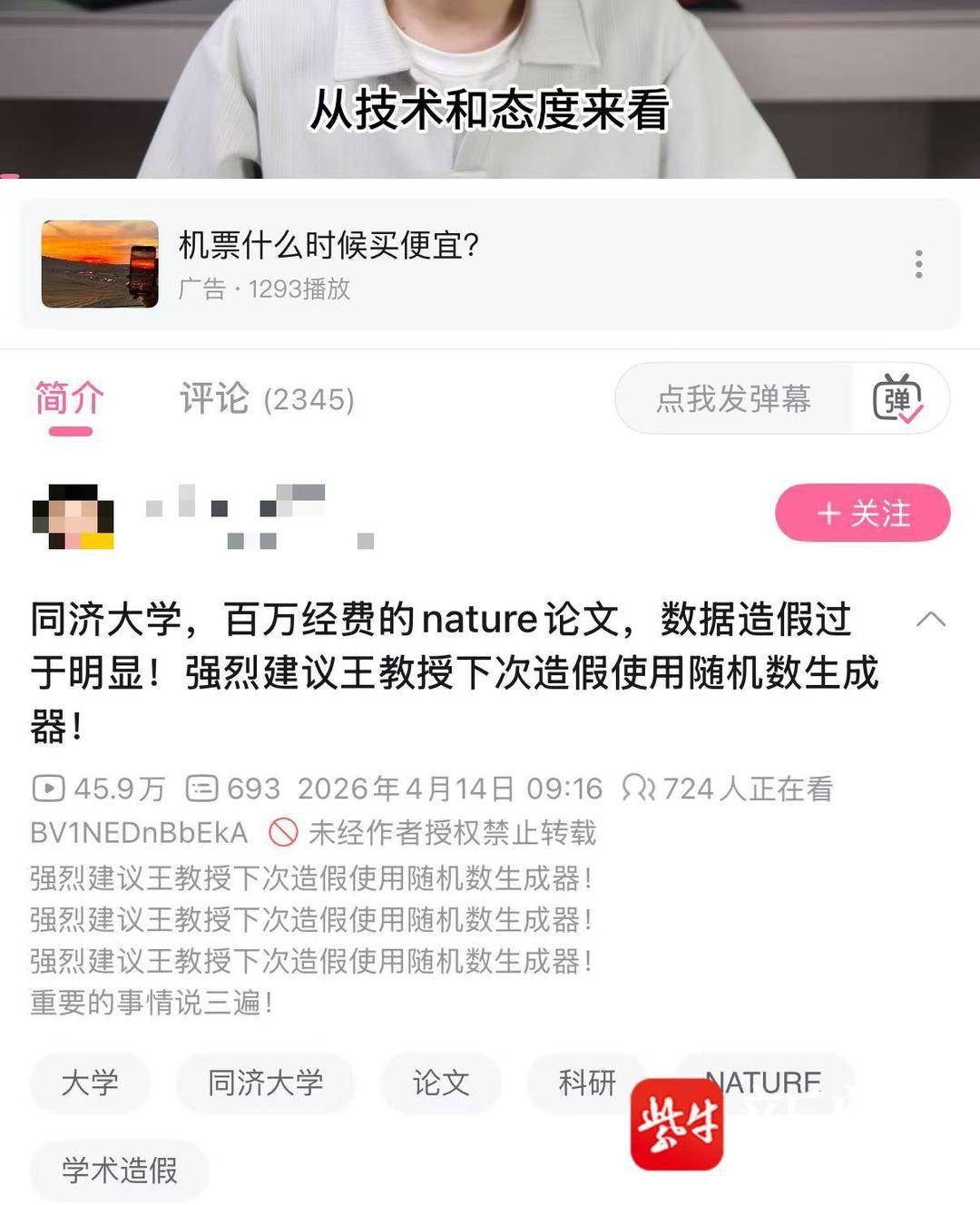 近日,有博主发布视频质疑同济大学特聘教授,同济大学生命科学与技术学院院长王某的nature论文涉嫌数据造假。