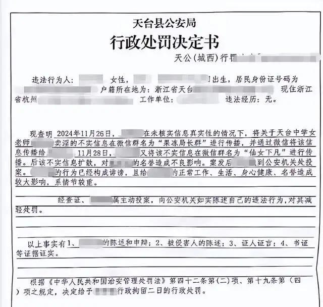 该事件起于2024年11月,一条关于“天台某中学女教师卖淫被抓”的消息在微信群中流传,后被天台县公安局确认不实。“95后”女教师林淼因在两个三人微信群及与两位好友的微信私聊中谈及该传言,被处以行政拘留两日。
