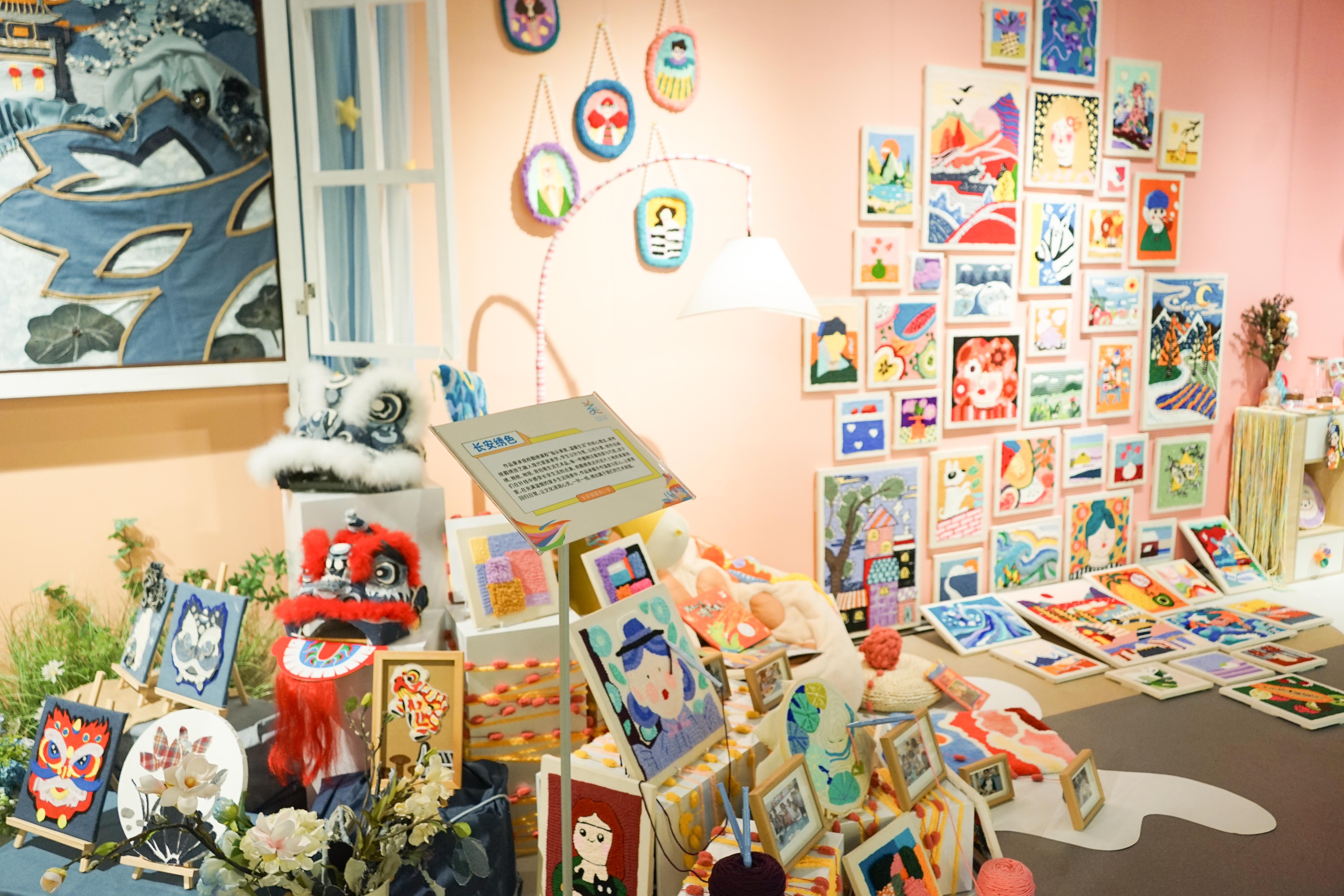 一走进展馆,“镇馆之宝·长安故事”主题展区便以跳脱的色彩和蜿蜒曲折的造型抓住了来宾的眼球。据主创介绍,展区以《创造亚当》中“指尖相触”的经典意象为灵感,巧妙联结代表过去与当下的人文使者、象征未来与科技的机器人使者,寓意长安镇在历史发展中的传承与创新。左侧“人”的形象,诠释了“人人绽放”的美育理想;右侧“机器人”则闪耀着长安以高新科技引领发展的时代光芒。两者指尖交汇之际,迸发出“Art For All长安之美”的美育成果结晶。