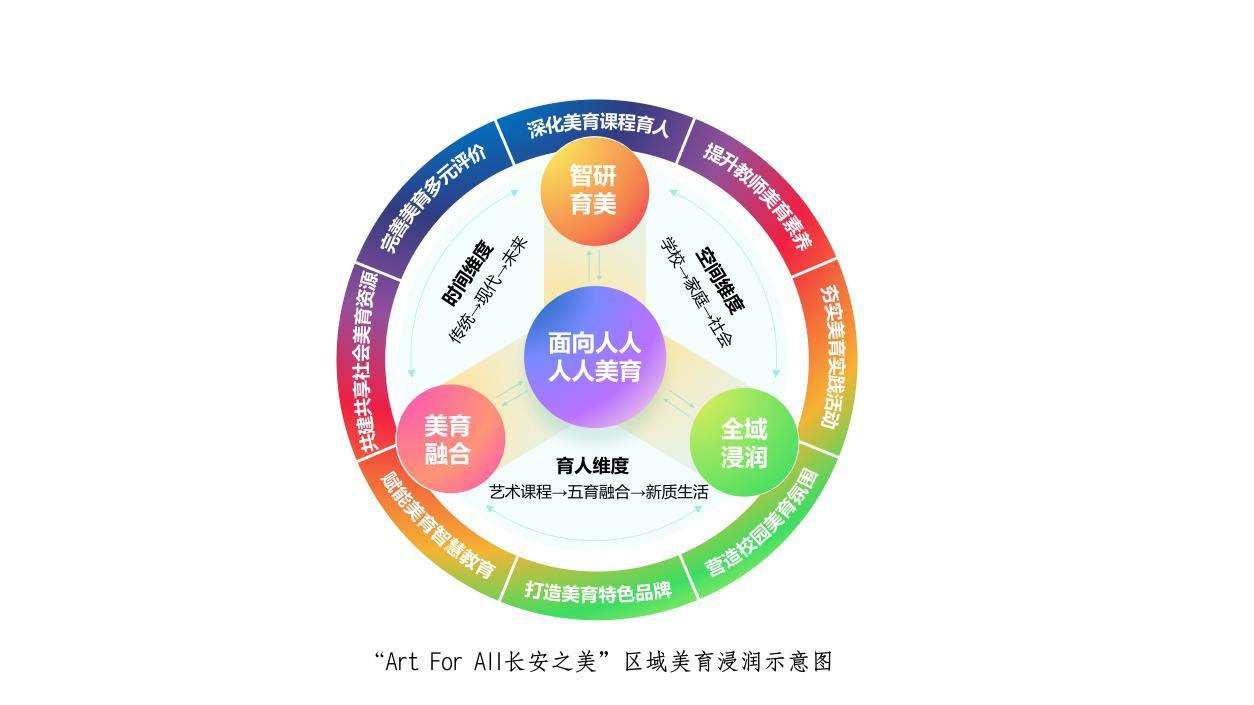 其中“1+3+8”指的是一个核心、三大路径和八大举措。一个核心指的是以“Art For All”为核心,从“面向人人”到“人人美育”,最终赋能“新质生活”,其包含时间维度、空间维度、育人维度三层内涵。“三大路径”指的是“智研育美,聚力赋能”,通过教研打磨特色课程体系,以科研助力教学创新;“美育融合,人人出彩”,将美育贯穿各类实践活动,搭配多元评价机制,借助信息化与AI技术赋能,让每个学生都能展现潜能、收获成长;“全域浸润,赋能生活”,构建“校园+家庭+社会”美育生态,链接内外资源滋养师生成长,打造“长安之美”特色品牌。“八大举措”则包括深化美育课程育人、提升教师美育素养、夯实美育实践活动、营造校园美育氛围、打造美育特色品牌、赋能美育智慧教育、共建共享社会美育资源、完善美育多元评价。