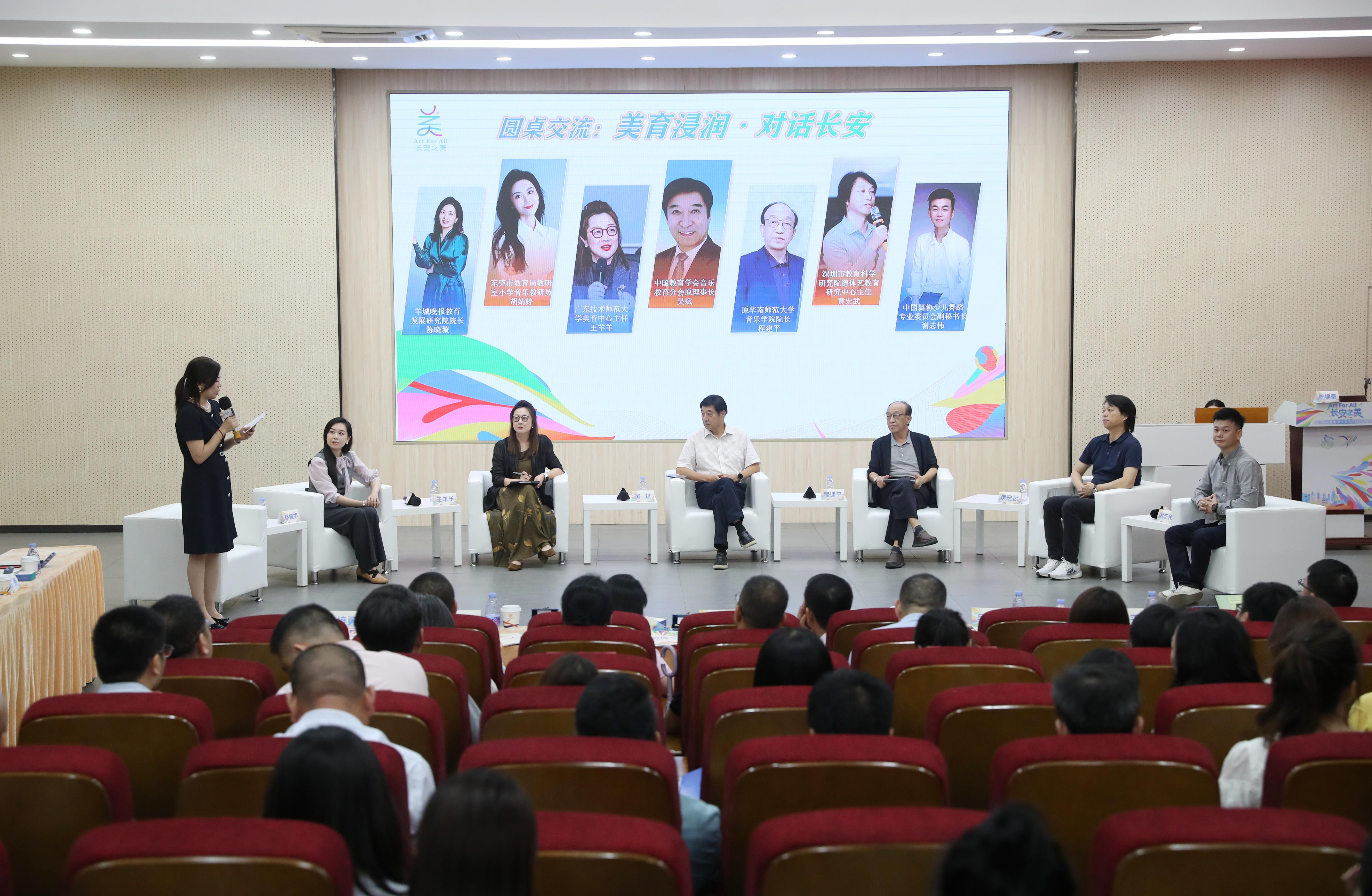 圆桌论坛成为本次活动的思想高地。论坛由羊城晚报教育发展研究院院长陈晓璇主持,来自高校、教研机构、中小学的六位美育实践者共同参与,从政策、课程、区域实践与一线教学等不同维度展开深入探讨。