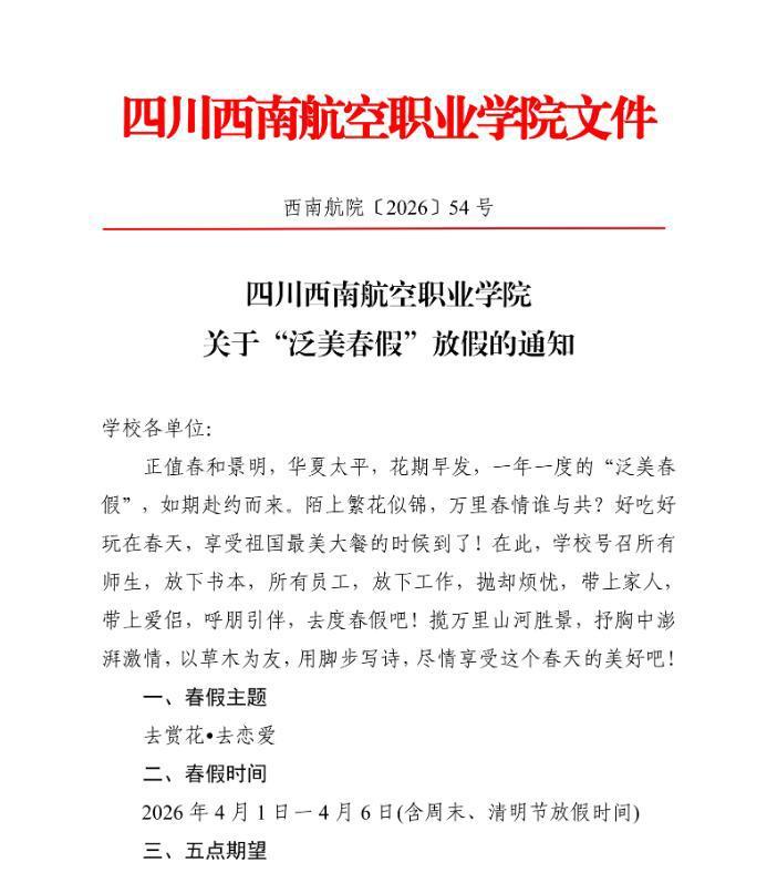 四川西南航空职业学院则在3月16日发布放春假的通知,其春假主题为“去赏花去恋爱”,春假时间为4月1日至4月6日。