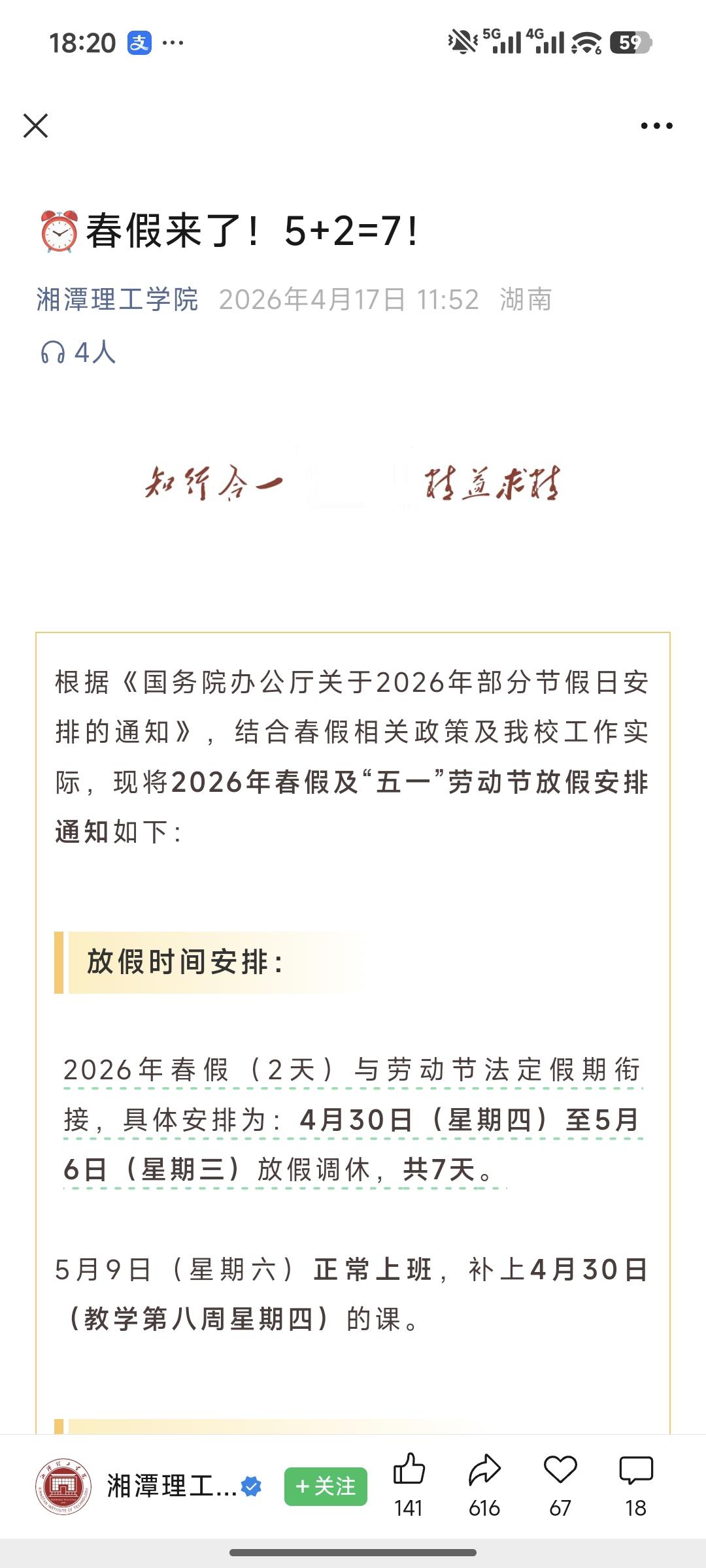 该学生还配发了一张《关于2026年春假及劳动节放假安排的通知》的图片,通知内容写道:2026年春假(2天)与劳动节法定假期衔接,具体安排为4月30日(星期四)至5月6日(星期三)放假调休,共7天。记者注意到,这名学生发帖定位显示为湘潭理工学院。