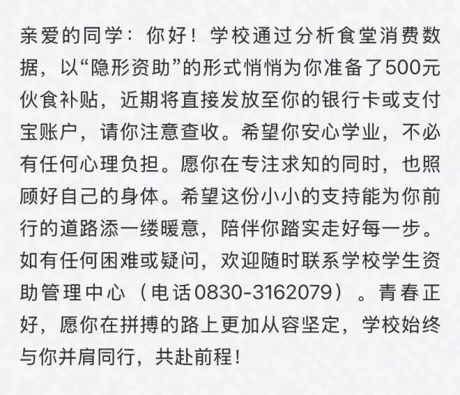 没有公开申请,没有班级评议,更没有张贴公示。一笔补助金悄然汇入账户,随之而来的是一条仅收信人可见的暖心短信——直到这时,许多学生才发现,自己被学校“选中”了。