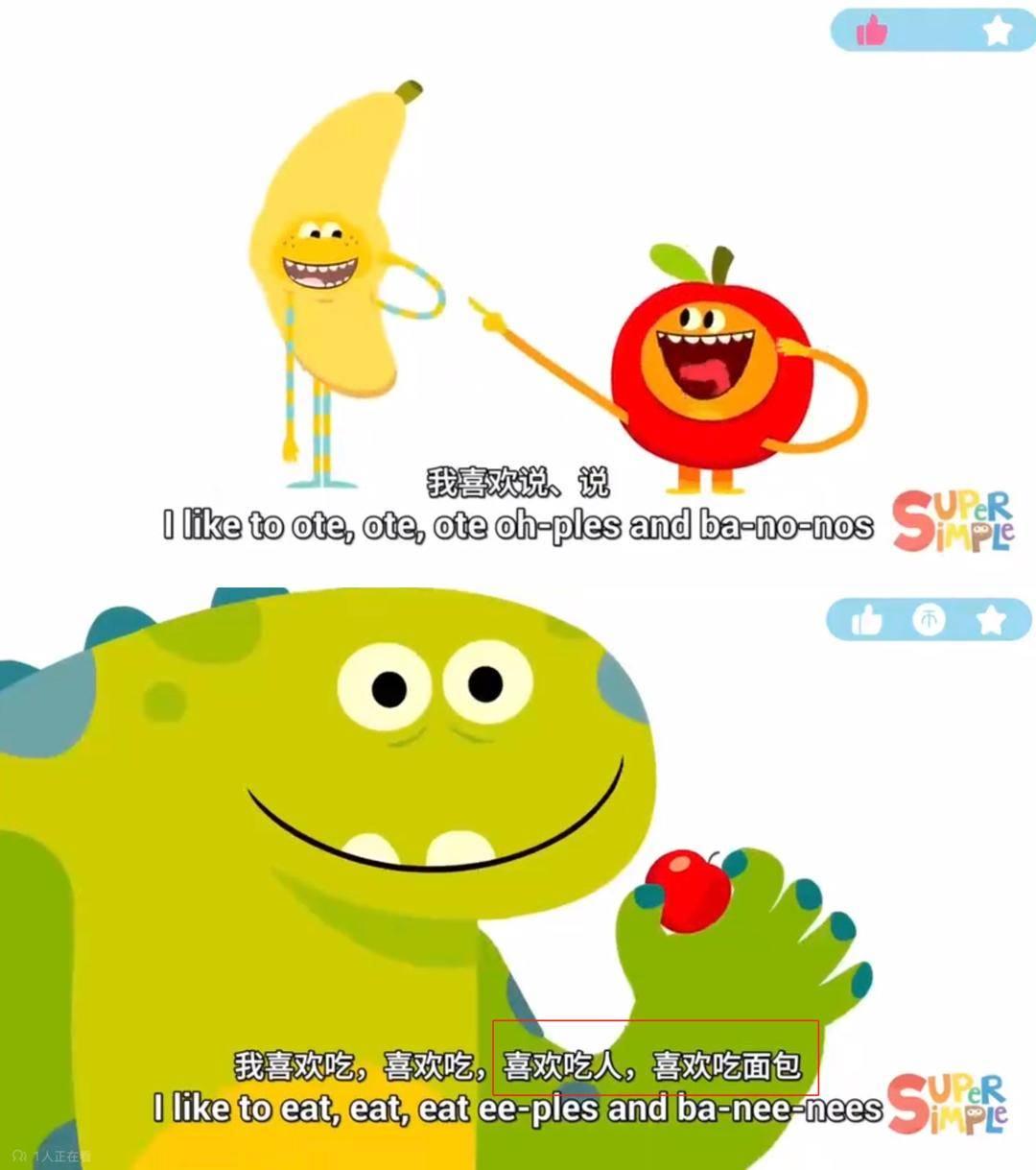 结合该儿歌的前后文语境及动画画面来看,帖文提到的“i-ples and ba-nigh-nighs”实际对应原句“apples and bananas”,正确中文翻译应为“苹果和香蕉”,而非视频中显示的“一夜情和一夜情”;而“I like to ite,ite,ite i-ples and ba-nigh-nighs”,其原文应为“I like to eat eat eat apples and bananas”,正确翻译是“我喜欢吃苹果和香蕉”,而不是“我喜欢在那里,在晚上”。