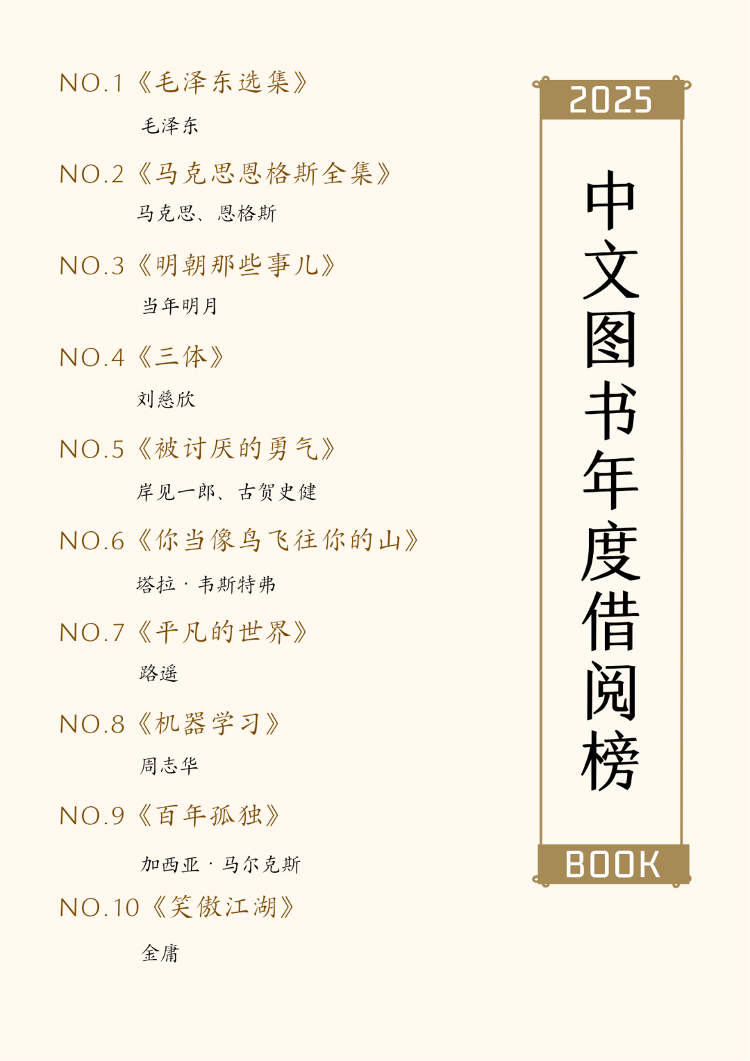 2025年中大图书馆中文图书年度借阅榜(纸质)前十依次为:《毛泽东选集》(毛泽东)、《马克思恩格斯全集》(马克思、恩格斯)、《明朝那些事儿》(当年明月)、《三体》(刘慈欣)、《被讨厌的勇气》(岸见一郎、古贺史健)、《你当像鸟飞往你的山》(塔拉·韦斯特弗)、《平凡的世界》(路遥)、《机器学习》(周志华)、《百年孤独》(加西亚·马尔克斯)、《笑傲江湖》(金庸)。