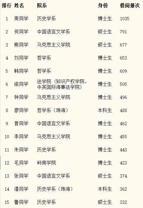 2025年个人借阅册次前15名中,历史学系博士生周同学以1035册高居榜首,成为年度“借书王者”,在全国高校公开的个人借阅记录中也属于顶尖水平。