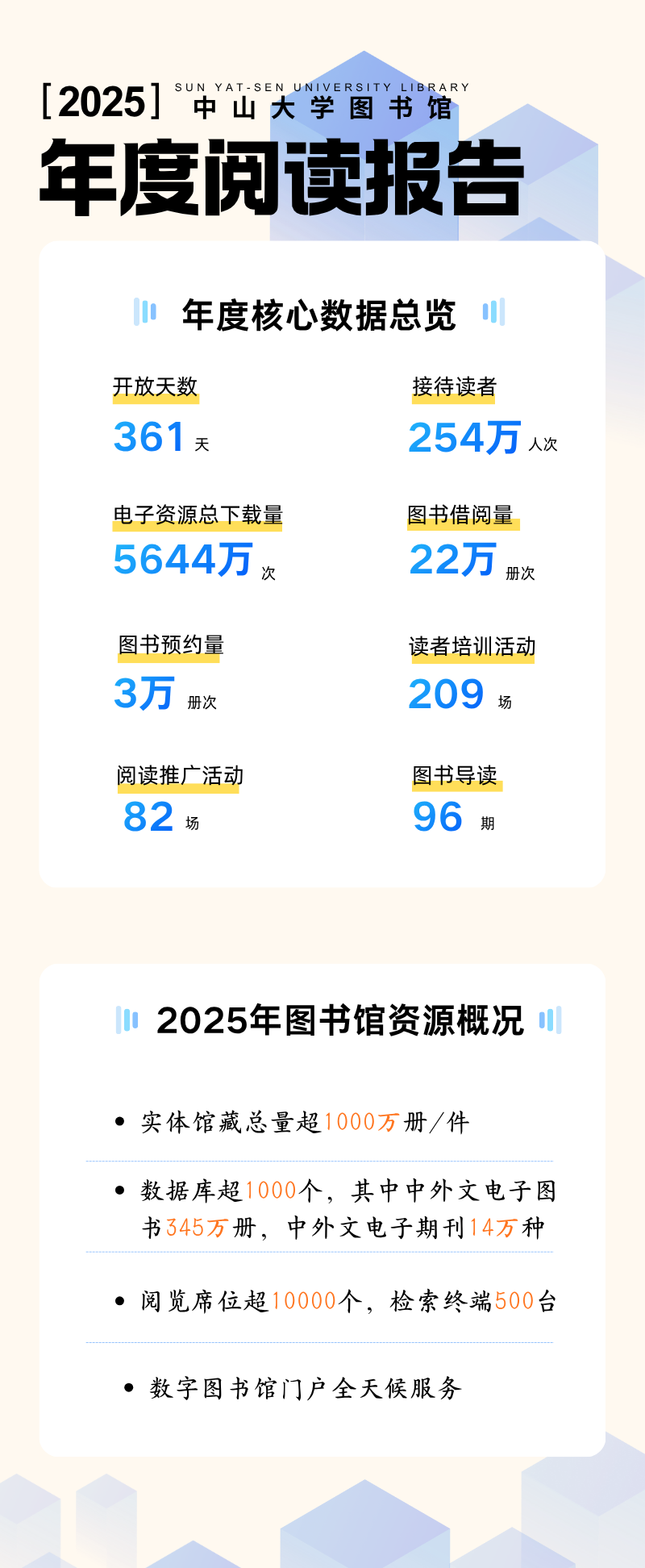 在4·23世界读书日来临之际,中山大学图书馆正式发布《2025年度阅读报告》。报告显示,2025年图书馆开放361天,接待读者254万人次,纸质图书借阅量22万册次,电子资源总下载量高达5644万次。其中,个人纸质借阅最高纪录达到惊人的1035册,由历史学系博士生周同学创造,相当于平均每天阅读2.8本书。