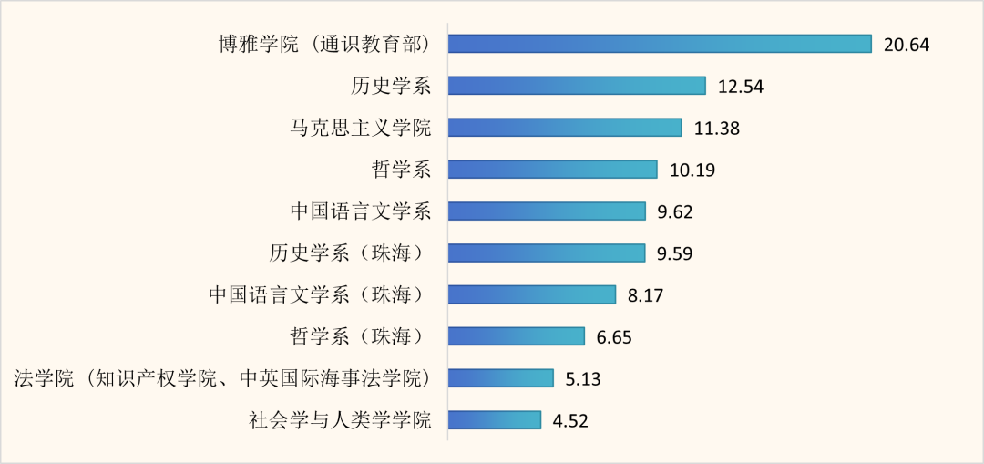 按人均借阅册次统计,博雅学院(通识教育部)以20.64册高居各院系第一,历史学系(12.54册)、马克思主义学院(11.38册)、哲学系(10.19册)、中国语言文学系(9.62册)分列第二至第五位。珠海校区历史、中文、哲学三系均进入前十。从总借阅量看,中国语言文学系以11592册居首,法学院、历史学系紧随其后。这一格局与中大往年趋势高度一致,显示出人文社科主导的阅读文化已成为重要特征。