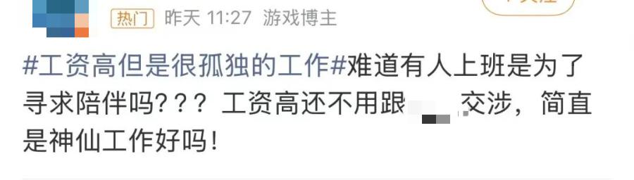 近日,话题#工资高但是很孤独的工作#冲上热搜第一,引发全网热议。