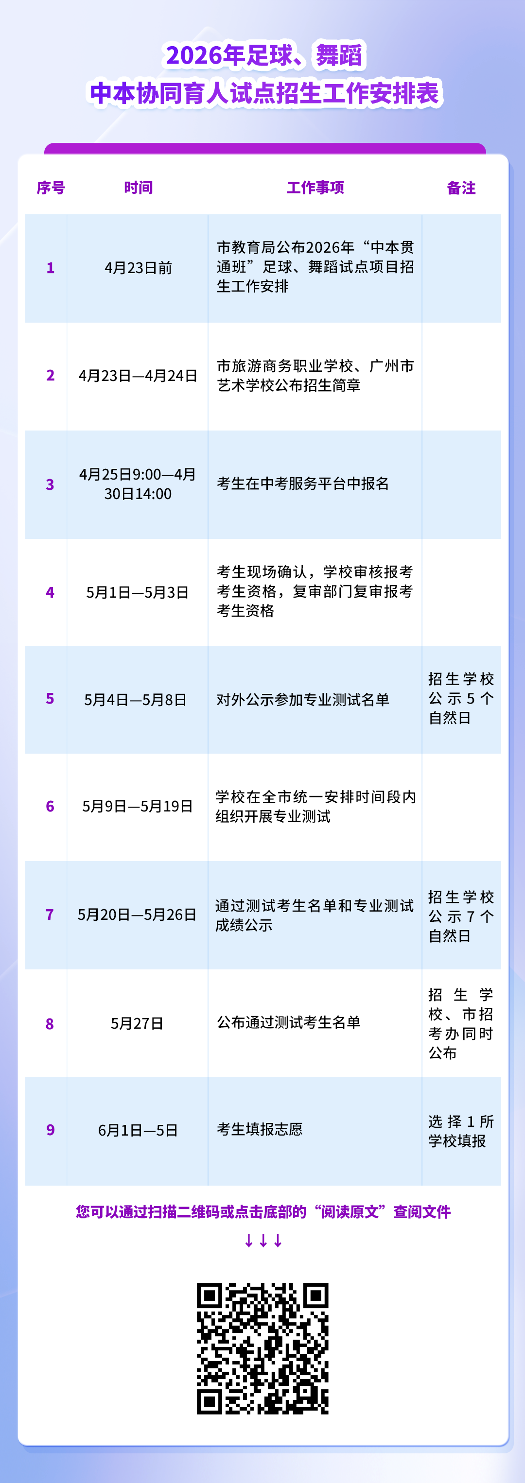 据悉,今年“试点项目”招生计划共58个,在两所中职落点实施。其中,广州市旅游商务职业学校开展足球运动方向中本贯通试点,对接广州体育学院;广州市艺术学校开展舞蹈表演(芭蕾舞)试点,对接广州大学的舞蹈编导专业。两者均面向参加广州市2026年初中学业水平考试的应届初中毕业生招生,专业招生不分男女。