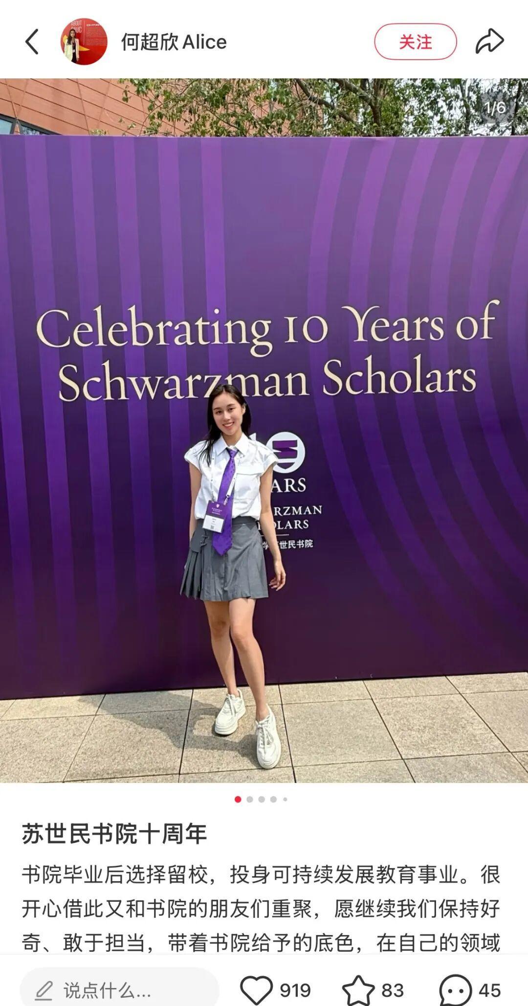 何超欣在社媒发帖称:书院毕业后选择留校,投身可持续发展教育事业。很开心借此又和书院的朋友们重聚,愿继续我们保持好奇、敢于担当,带着书院给予的底色,在自己的领域里踏实前行。